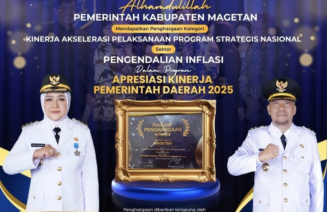 Pada Senin, 1/12/2025 Pemerintah Kabupaten Magetan yang dalam hal ini diwakili oleh Bapak Wakil Bupati menerima penghargaan kategori Kinerja Akselerasi Pelaksanaan Program Strategis Nasional sektor Pengendalian Inflasi. Bertempat di Surabaya, penghargaan diserahkan langsung oleh Menteri Dalam Negeri, yaitu Bapak Tito Karnavian dalam Program Apresiasi Kinerja Pemerintahan Daerah 2025.